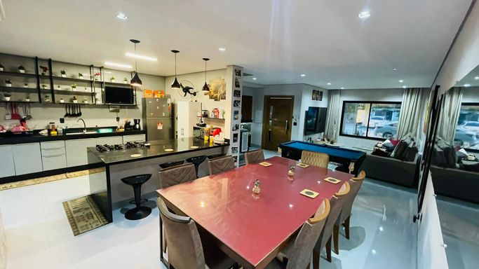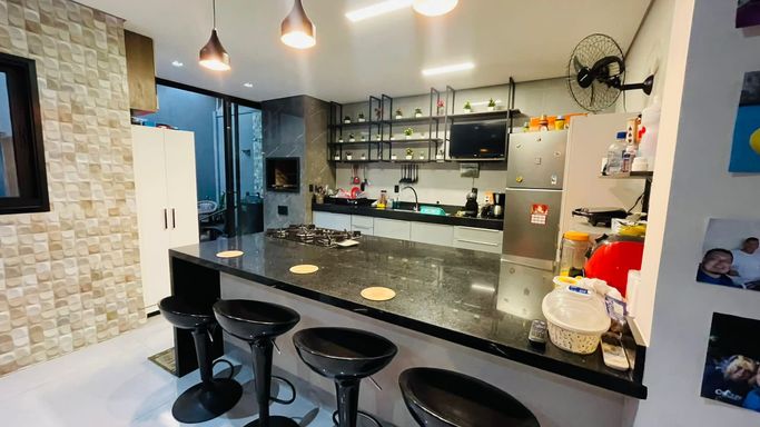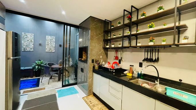 Sobrado de 160m com 03 suítes, lavabo, sala de estar e jantar integrado com cozinha gourmet, lavanderia, piscina e 02 vagas de garagem.